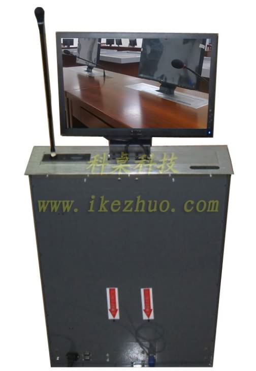 19寸科桌液晶屏升降器需要使用顯示屏?xí)r,隱藏在會議桌內(nèi)部的升降機把顯示屏從會議下面升到桌子表面;當(dāng)不使用顯示屏?xí)r,升降機自動下降,顯示屏隱藏在會議桌內(nèi)部,防盜、防塵;保持桌子表面的平整和美觀。